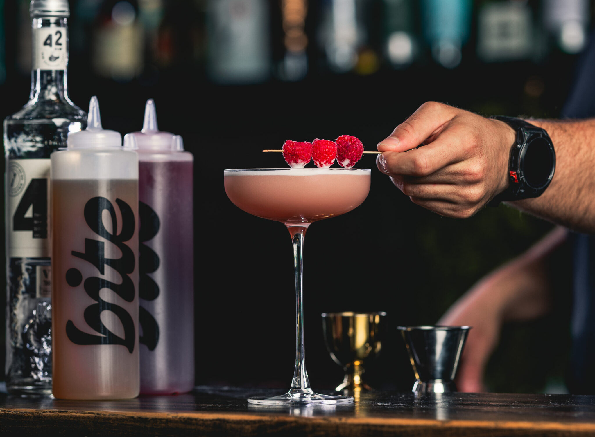 4. Garnish with raspberries on a skewer