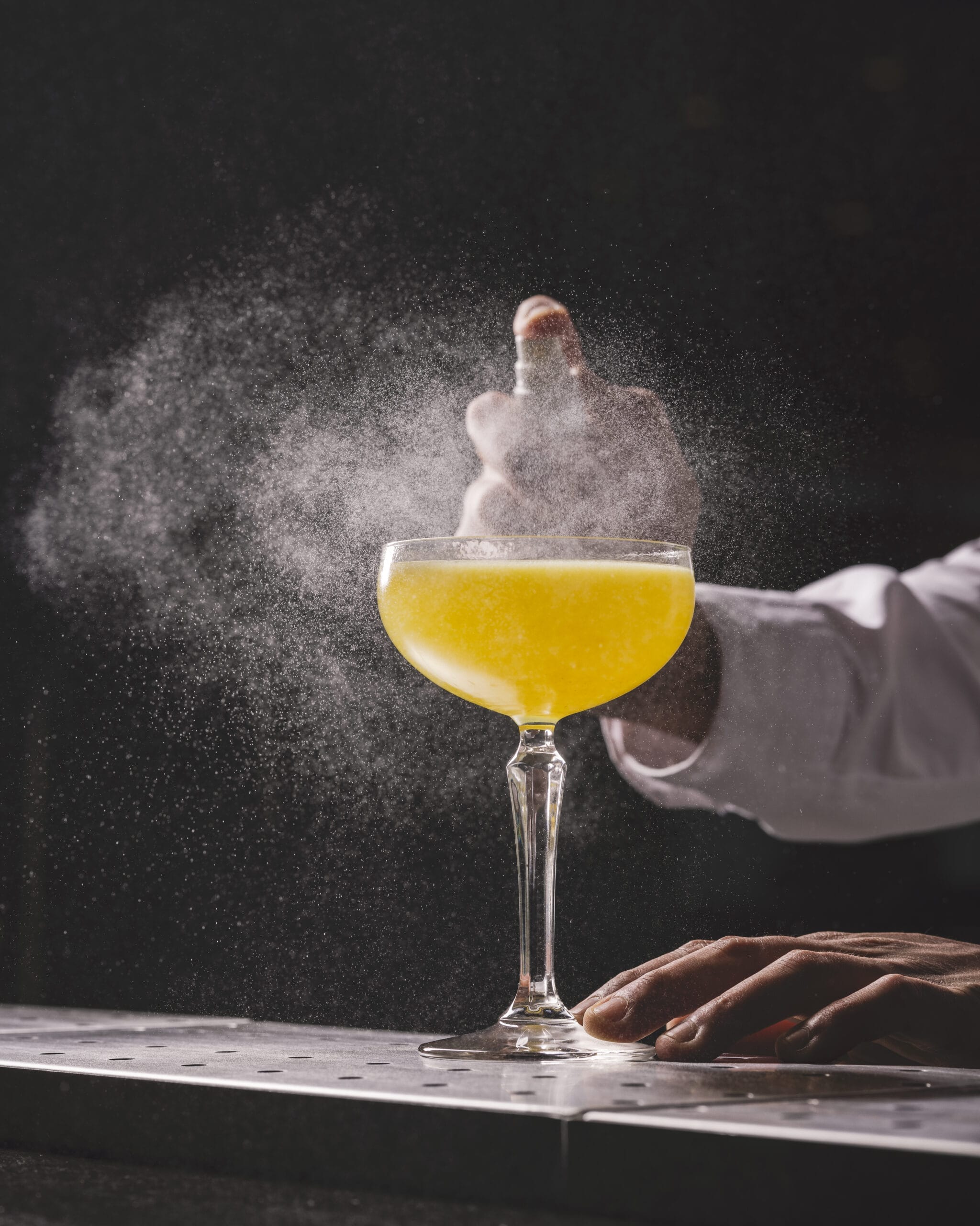3. Ein Coupe-Glas kühlen und den Cocktail fein abseihen