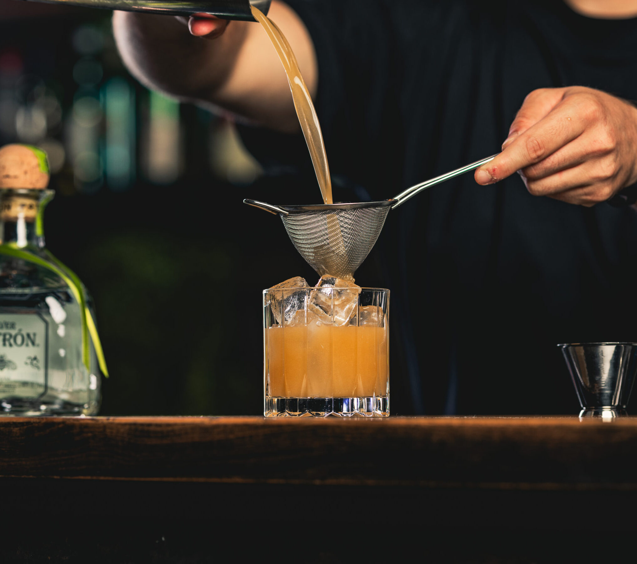 3. In ein Lowball-Glas mit Eiswürfeln abseihen